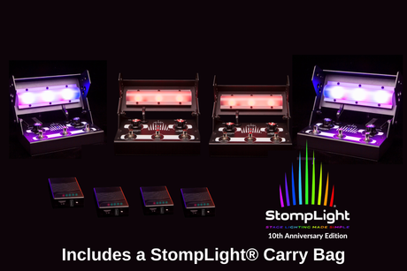 The StompLight® Pro Stage Lighting Effect Pedal features a patented LED lighting array mounted to an analog controlled effect pedal engineered to provide powerful stage lighting with effects. In the quartet bundle, this provides the following options for stage lighting coverage:
